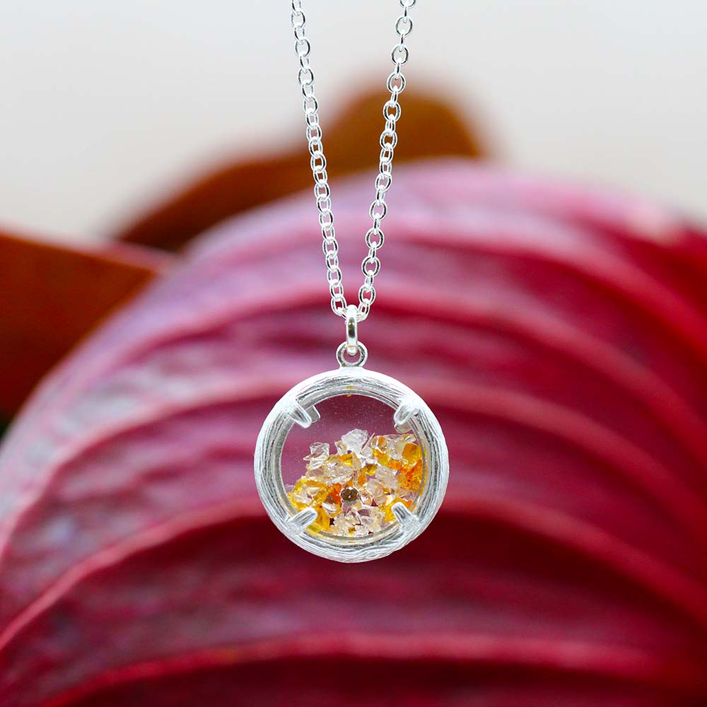 Alive with vibrant color and dynamic movement, the Mini Shaker Birthstone Necklace elevates an everyday outfit to an eye-catching ensemble. The two-sided glass chamber is framed by an organically styled, softly textured branch and filled with your choice of semi-precious stone. Choose your birthstone, your favorite color … any stone that resonates with you!
